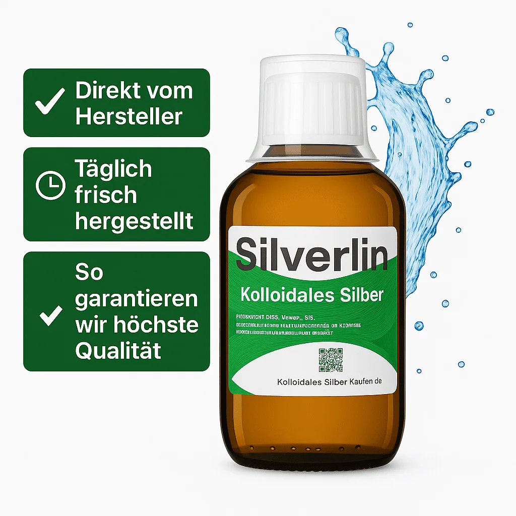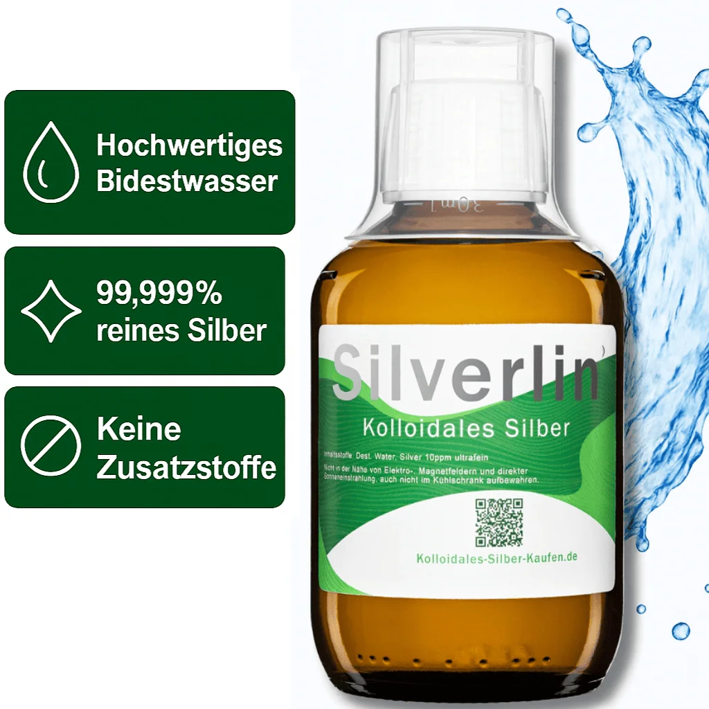 Qualität, die man spürt: Unser Kolloidales Silber wird nach höchsten Standards in Deutschland hergestellt. Wir verwenden reinstes Silber mit einer garantierten Reinheit von 99,999 % und hochreines Bidestwasser (doppelt destilliertes Wasser). Diese Kombination garantiert ein reines und hochwertiges Produkt, frei von unnötigen Zusätzen.